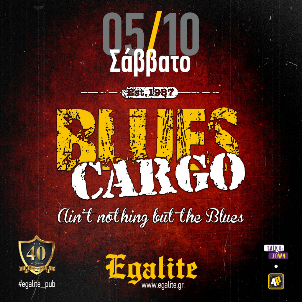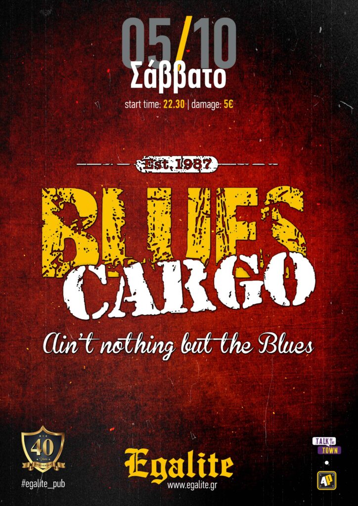 Blues Cargo (est. 1987) ♫ H μακροβιότερη και πιο αυθεντική blues μπάντα της Αθηναϊκής σκηνής. Με “αδυναμία” στο feel και τον ήχο του Chicago, στην μακρόχρονη πορεία τους έχουν συνεργαστεί επί σκηνής με θρύλους του blues, όπως οι Louisiana Red, Guitar Shorty, U.P Wilson, Lurrie Bell, Big Time Sarah, Eddie C. Campbell και πολλούς άλλους! Πλησιάζοντας “απειλητικά” τα 40 χρόνια ζωής, με συνέπεια και αφοσίωση στο μουσικό ιδίωμα που υπηρετούν, κάθε εμφάνισή τους αποτελεί τελετουργία & μύηση στον υπέροχο blues πλανήτη.