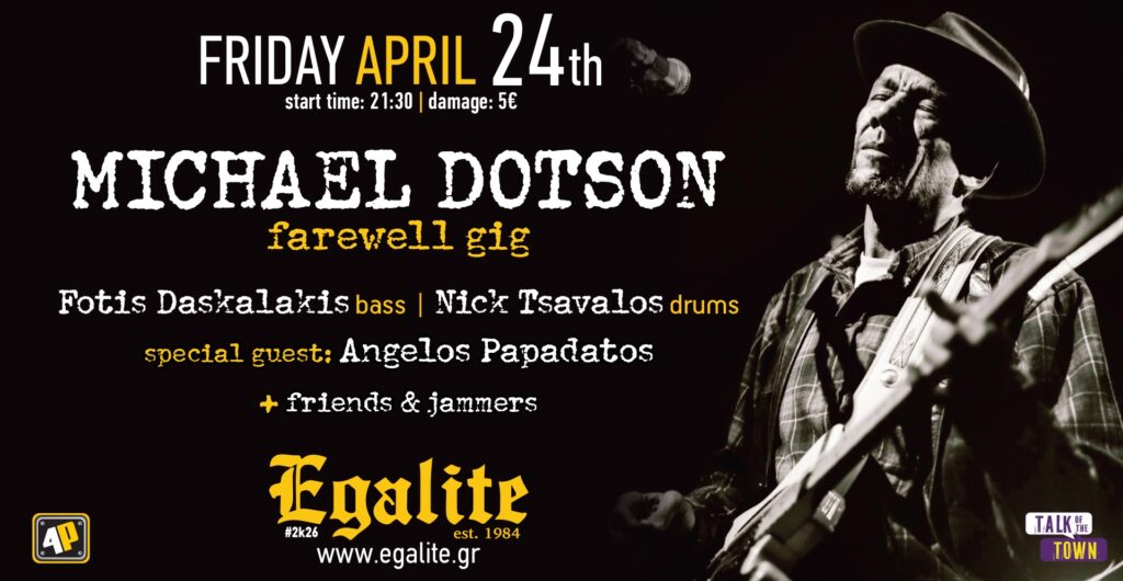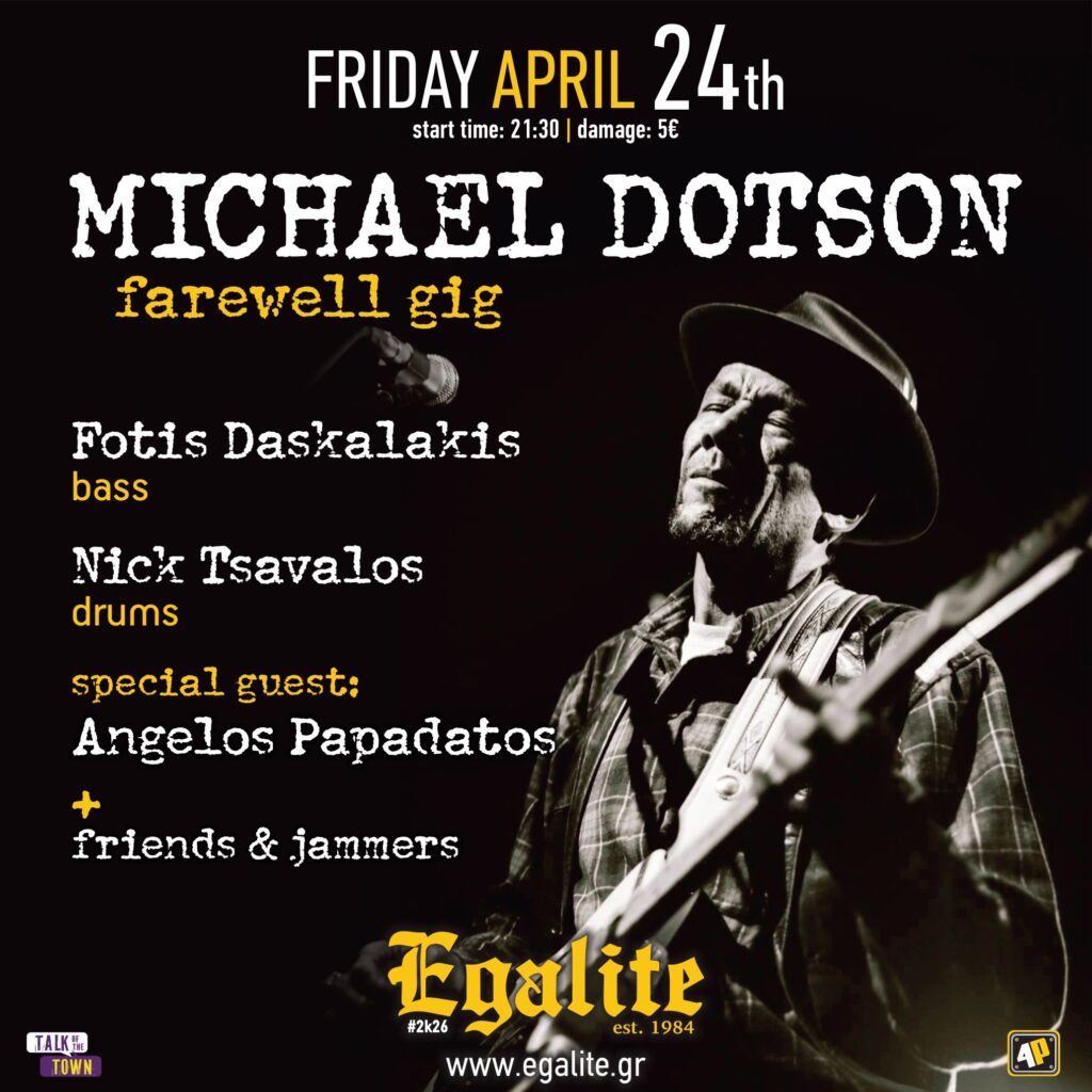 O Michael Dotson ολοκληρώνει τις φετινές – εν Ελλάδι – δράσεις του με άλλο ένα εμφατικό live, λίγο πριν αναχωρήσει για το εξωτερικό και τις Η.Π.Α την Παρασκευή 24 Απριλίου ♪